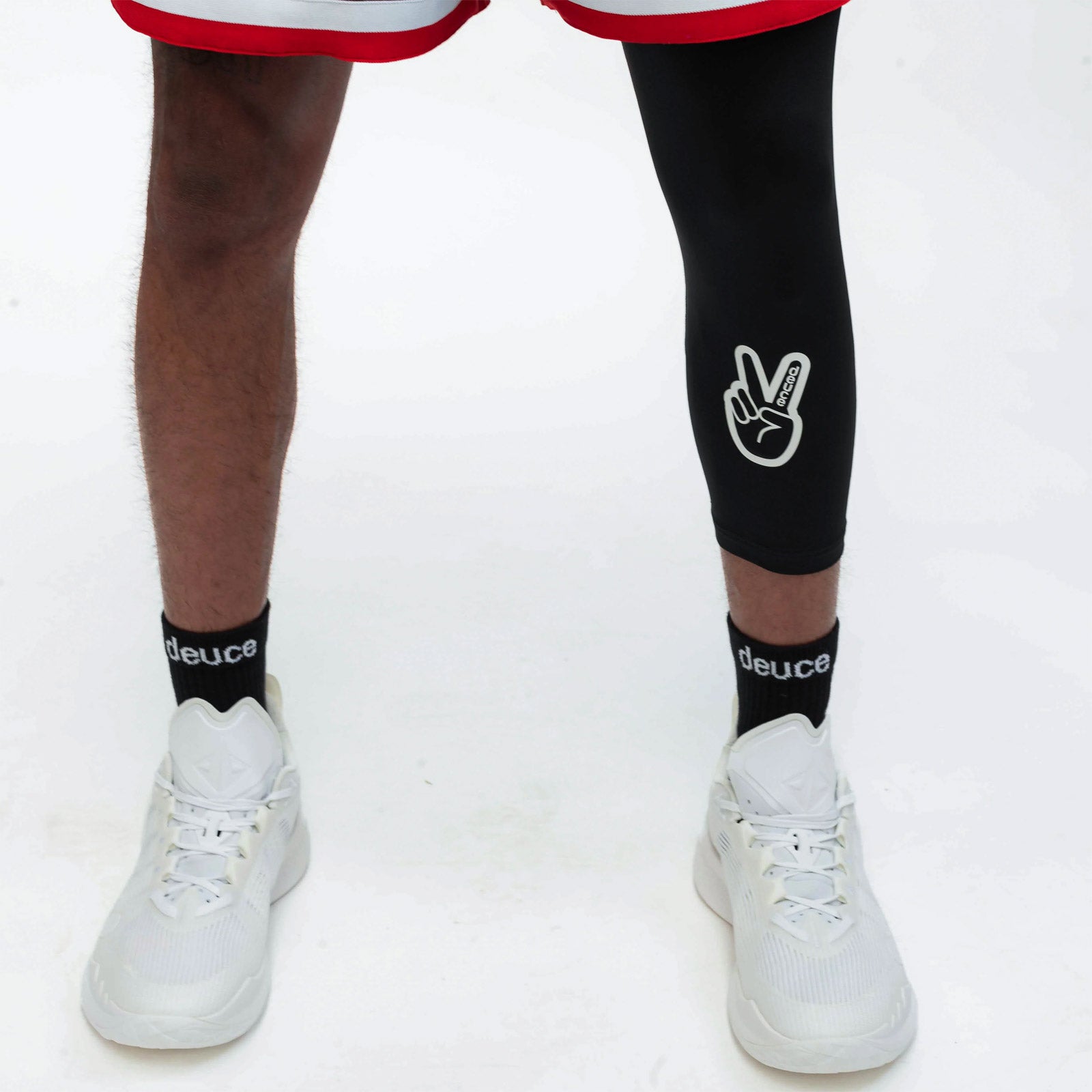 Las mallas de baloncesto Deuce One Legged son las mallas de baloncesto de moda. El logotipo del símbolo de la paz de Deuce se encuentra en la parte delantera de la espinilla de la pierna izquierda y en la parte posterior forma la palabra "deuce". Son cómodas, livianas y están diseñadas para brindar una compresión cómoda.